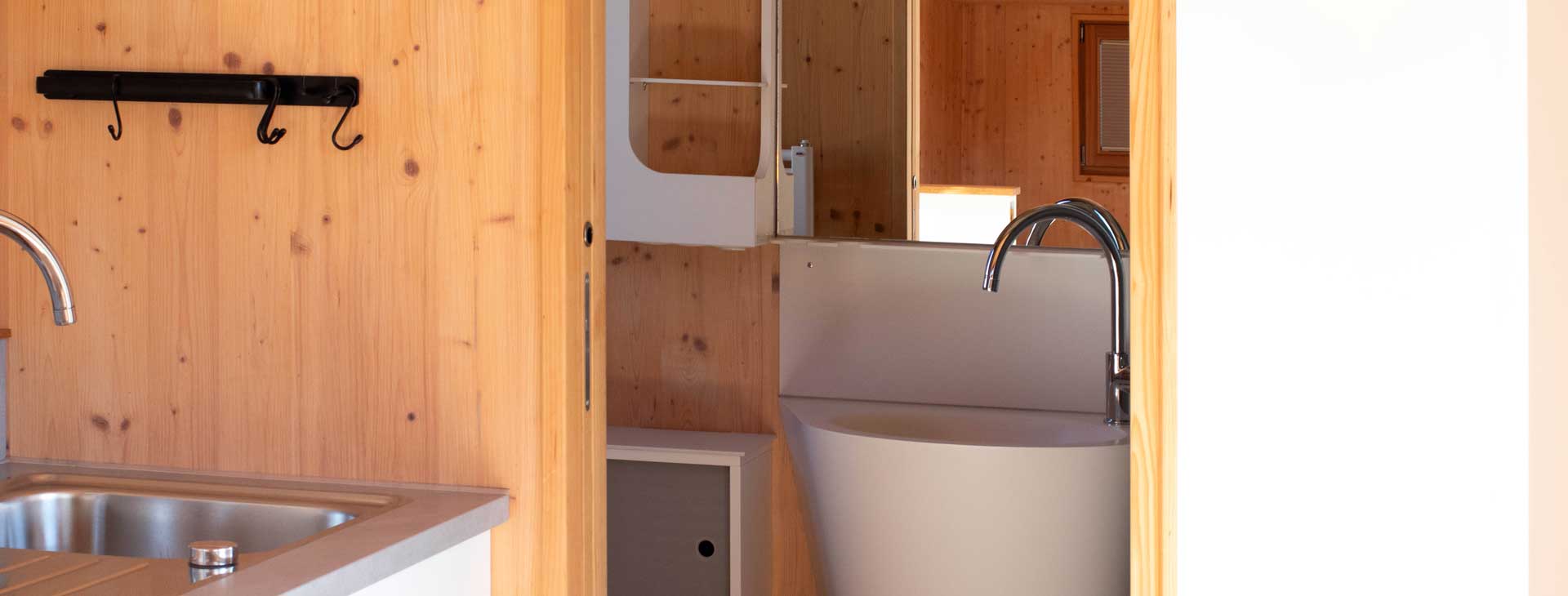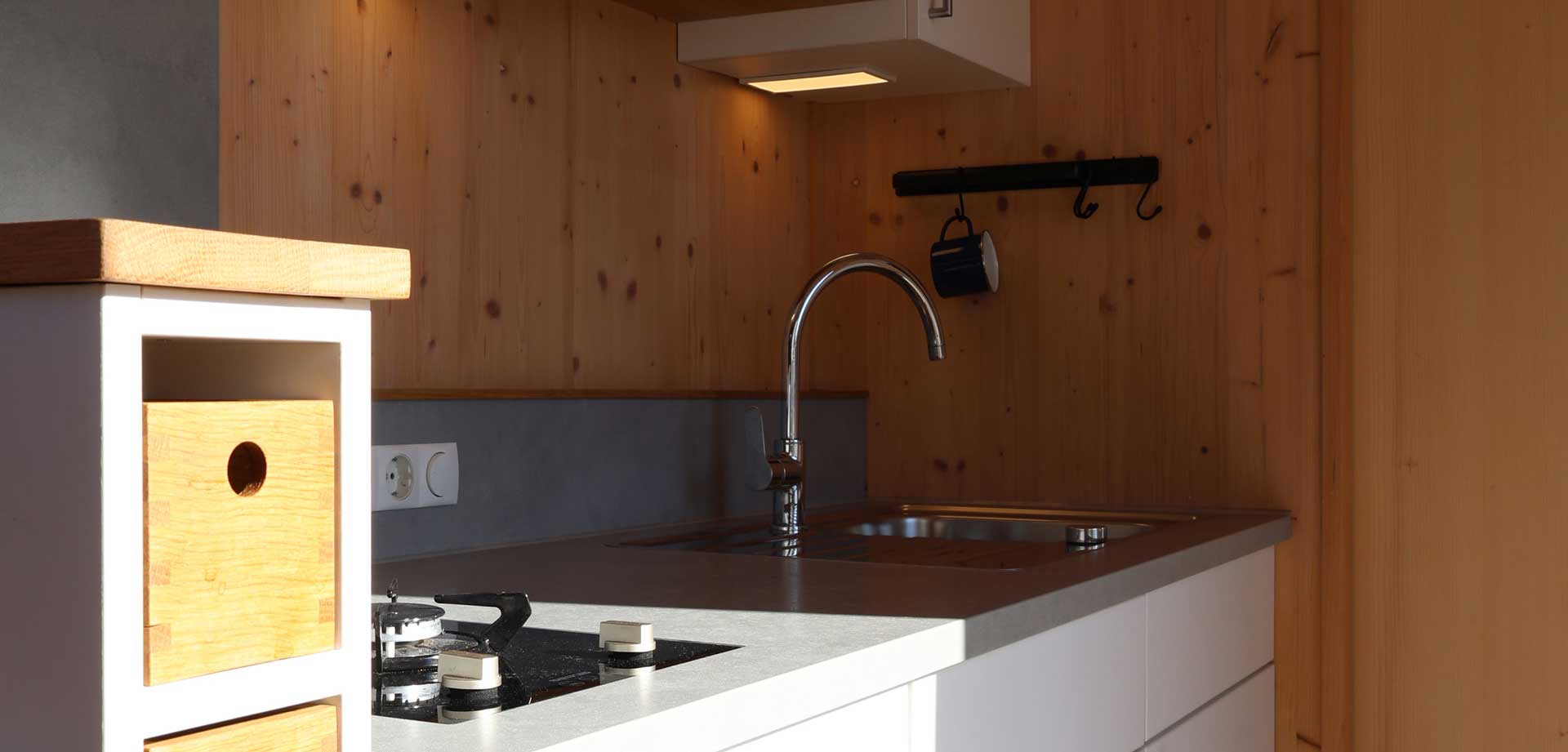Die Küchenzeile in unseren Tiny Houses Offices bietet alles, was Sie für die Zubereitung von Mahlzeiten benötigen. Neben einem normalen Kühlschrank, welcher ausreichend Platz für Ihre Lebensmittel bietet, ist die Küche mit Hilfe eines Zweiflächen-Gaskochfeld ausgestattet. Dieses ermöglicht Ihnen eine schnelle Zubereitung Ihrer Speisen.